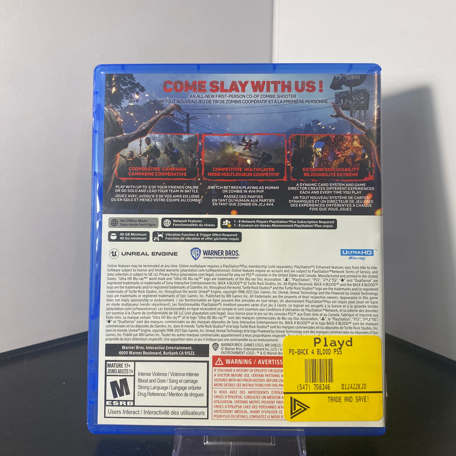 Get ready to dive into the thrilling world of survival horror with Back 4 Blood - PS5, now available at Generation C. This action-packed game offers heart-pounding excitement as you battle against relentless hordes of zombies. Our local business is committed to providing the latest and greatest in video games and collectibles, making us your go-to spot for unforgettable gaming experiences. Shop with us and enjoy top-notch customer service, ensuring a seamless and satisfying purchase.