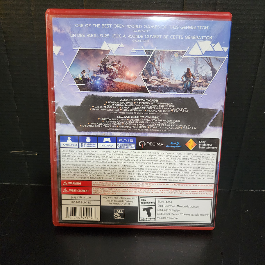 Experience the thrilling adventure of Horizon Zero Dawn Complete Edition on PS4, now available at Generation C. Traverse a post-apocalyptic world teeming with robotic creatures and uncover the mysteries of Earth's past. Complete with the Frozen Wilds expansion, this edition offers extended gameplay and immersive storytelling. Shop with us locally to support a business dedicated to excellent service and community values. Get your copy today and join the hunt!